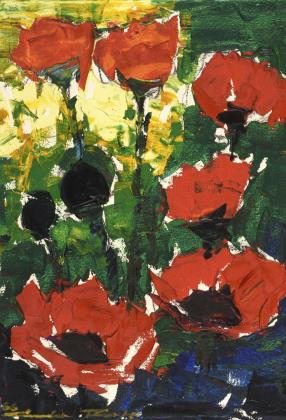 Pastos und grob gespachtelte Mohnblüten, vor grünem Hintergrund