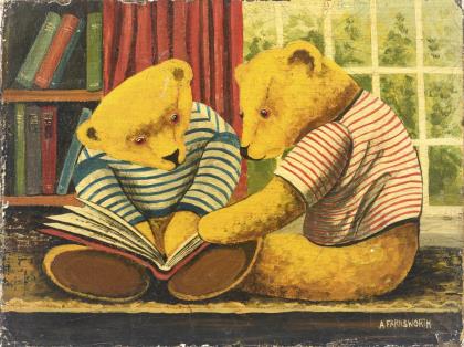 Die beiden Teddies mit einem Buch auf dem Sims vorm Fenster