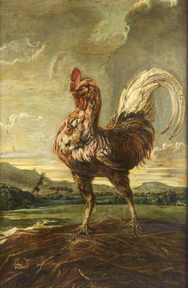 Großes Bildnis eines Hahns auf dem Misthaufen in einer weiten Vorgebirgslandschaft