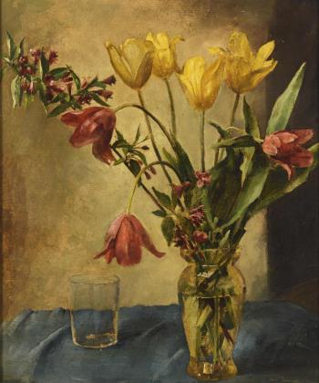 Leeres Glas neben Tulpenstrauß in einer gelblichen Glasvase