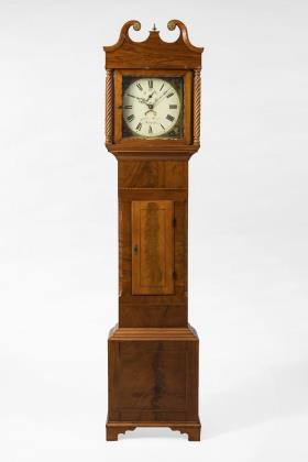 Gerades Gehäuse mit kleiner Pendeltür, Aufsatz mit geschweift gerahmtem Zifferglas, seitlichen Spiralsäulen und geschweiftem Giebel