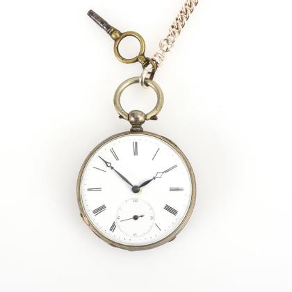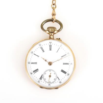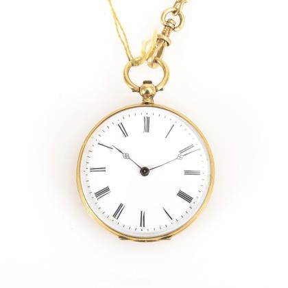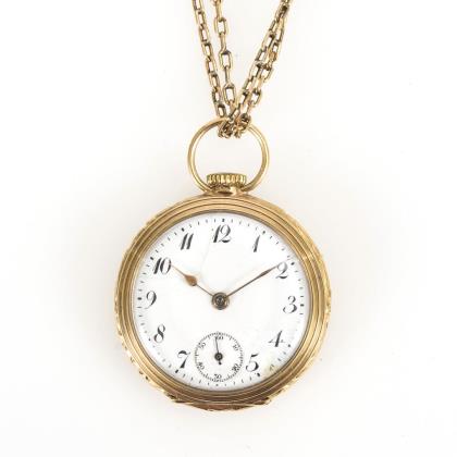 Lépine-Gehäuse mit guillochiertem und graviertem Rückdeckel mit leerer Wappenreserve. An jünger ergänzter 925 gepunzter Gliederkette mit Karabiner und großem Federring, L 29,5 cm
