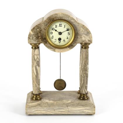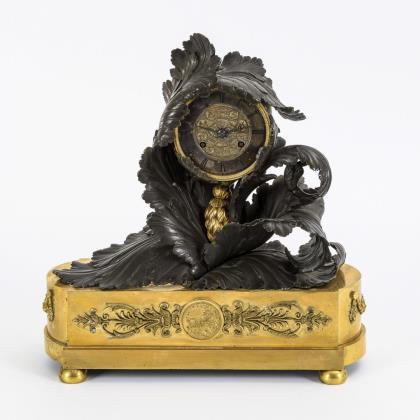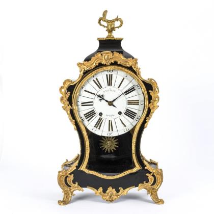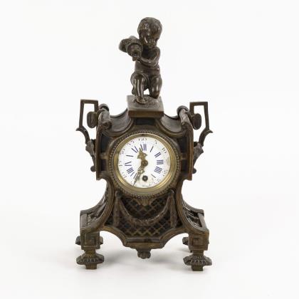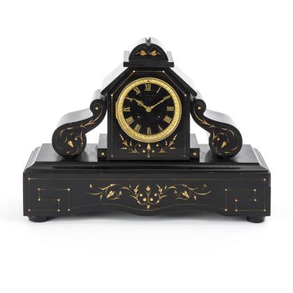 "Japy Frères" gemarktes Werk mit Halbstundenschlag auf Glocke, läuft. Breiter Sockel mit architektonischem Uhrengehäuse und flankierenden Voluten, verziert mit geritztem und bronziertem Floraldekor. Facettiert verglastes, schwarzes Zifferblatt mit aufgelegten