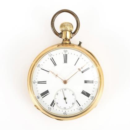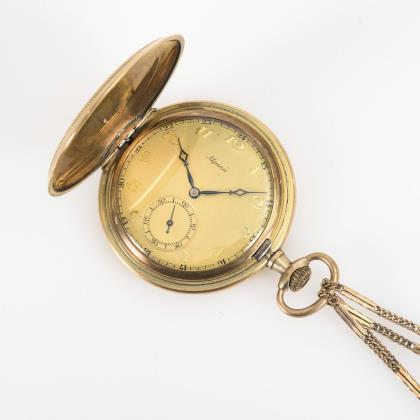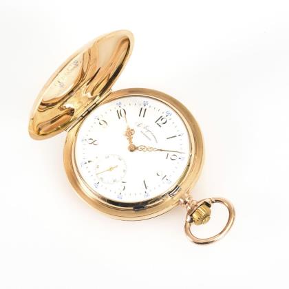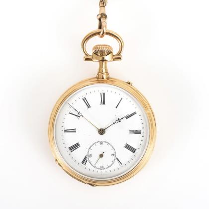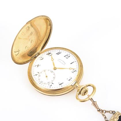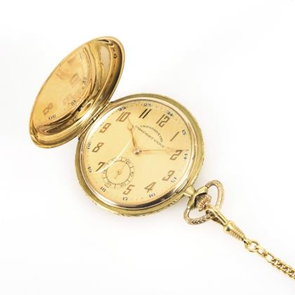 Gold savonnette on a gold-plated watch chain. Chronomètre Corgémont Watch.