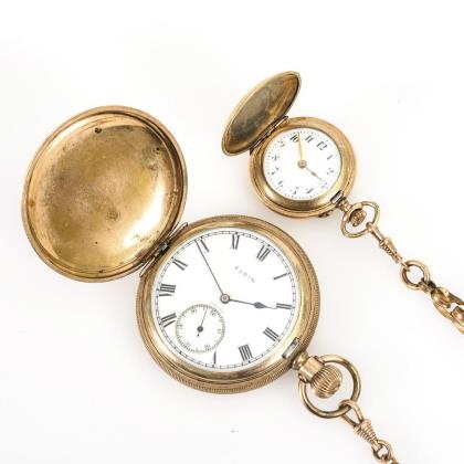 Guillochierte und fein gravierte Doublé-Gehäuse. Elgin: Ankerhemmung, Werknummer 28309368, weißes Emailzifferblatt mit römischen Zahlen, Ø 5,1 cm, Gliederkette mit Zieranhänger und Federring, L 14 cm. Steinmeyer: Zylinderhemmung, arabische Zahlen, Ø 3,1 cm, Gliederkette ohne Federring, L 21 cm. Beide Werke laufen