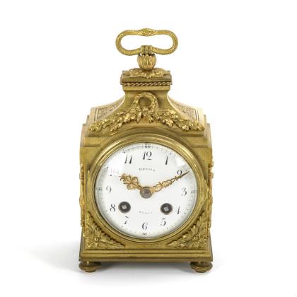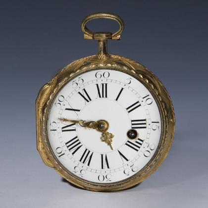 Werk signiert. Vergoldetes Gehäuse, fein graviert, innen Leton signiert. Vergoldetes Werk mit Kette und Schnecke, filigran gearbeiteter Kloben, gegliederte Pfeiler. Weißes Email-Zifferblatt, schwarze römische und arabische Zahlen. Schlüsselaufzug. ø 4,8 cm. 76,8 g