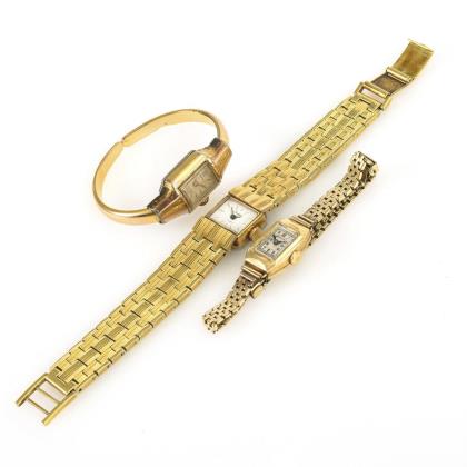 1x Doublé: Frackuhr mit kleinem Zifferblatt und Louis Quinze-Zeigern, Werk mit Zylinderhemmung, läuft nicht, an profilierter Gliederkette, ohne Federring, L 20,5 cm. 1x Argentan "Tissot Antimagnétique": Mariage-Uhr, ohne Armband, weißes Zifferblatt mit arabischen Zahlen, kleiner Sekunde und Lochzeigern, gemarktes Werk mit Ankerhemmung, Werknummer 620349, läuft kurz an. 1x Nickel "Record": glattes Lépine-Gehäuse, weißes Emailzifferblatt mit roten und schwarzen arabischen Zahlen, kleiner Sekunde und Kathedralzeigern, gemarktes Werk mit Ankerhemmung, läuft