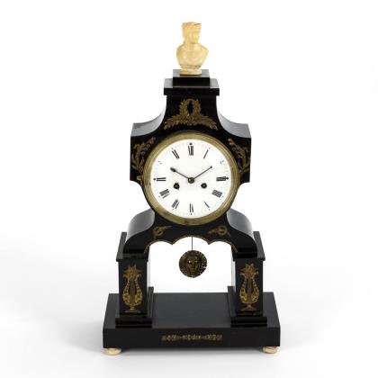 Lyraförmige Pendule auf geschweiftem Rundbogenportal mit Postamenten und flachem Sockel, weibliche Büstenbekrönung