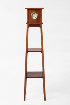 Säulenuhr mit Bogengiebel und großem Zifferblatt, auf gestuftem Rechtecksockel