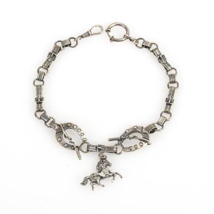 Beriebenes Galonné-Gehäuse mit gravierter Szene dreier Männer beim Schwur. An jünger ergänzter Gliederkette mit Karabiner und Federring, 925 Silber gepunzt, L 29,5 cm