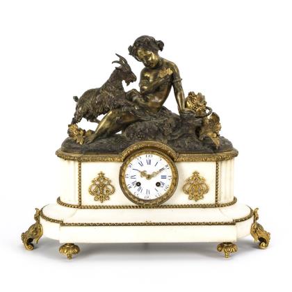 Hoher ovaler Profilsockel im Louis Seize-Stil mit bekrönendem Natursockel, einer Mädchenplastik mit Weinrebendekor und einem Ziegenbock