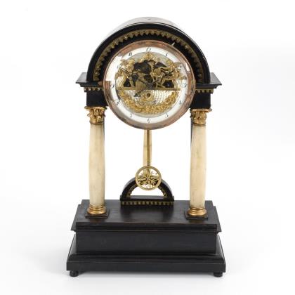 Portaluhr mit 4 Säulen, dreifach gebogtem Giebel und facettiertem Sockel