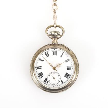 Silver pocket watch with silver watch chain. Numa Gagnebin.
