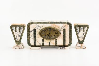 Architektonisches Gehäuse mit gestuftem Sockel, Eckpilastern, gewalmtem Dach und floraler Zapfenbekrönung. Dazu 2 passende, 1-flammige Leuchter mit Puttenfiguren