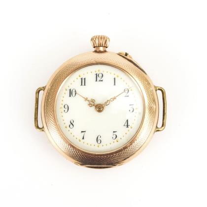 Lépine-Gehäuse mit guillochiertem Rückdeckel und ligiertem Monogramm "JK". An Gliederkette mit Karabiner und Federring, 585 Gold geprüft