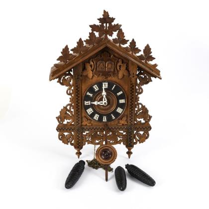 Beschnitzte Wanduhr mit reicher Blattzier und Bandintarsien, aufgesteckte zweiteilige Blattkrone