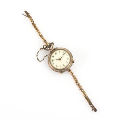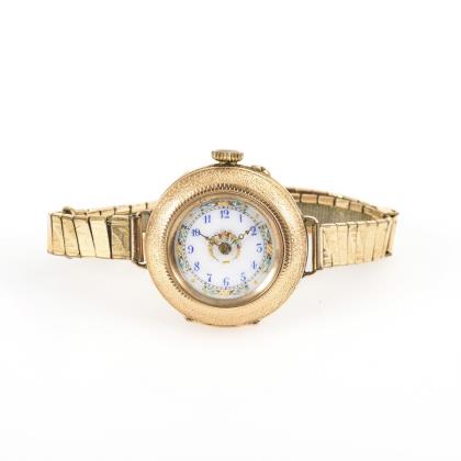 Gekörnt ziseliertes, offenes Goldgehäuse mit rückseitiger Floralgravur und Vogelmotiv, teils farbig emailliert. An jünger ergänztem Doublée-Schiebearmband mit Art-déco-Design, Tempo Patent, Andreas Staub gepunzt, L ca. 20 cm