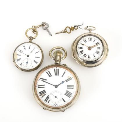 1x silberne englische Spindeluhr mit Schlüsselaufzug, schreitender Löwe/London/wohl 1780/TH gepunzt, Werk graviert "Samson London 5958", läuft an, Ø 4,2 cm, in silbernem Uhrenmantel, Ø 5,2 cm, gesamt 93 g. 1x versilbert (geprüft), 2. H. 19. Jh., glattes Gehäuse, Brückenwerk mit Zylinderhemmung und Schlüsselaufzug, läuft nicht, Ø 4,3 cm, 54 g. 1x große Argentan-Uhr, um 1900, Werk mit Ankergang und Kronenaufzug, läuft, Ø 6,5 cm, 186 g. Jeweils weißes Emailzifferblatt mit römischen Zahlen, teils kleine Sekunde