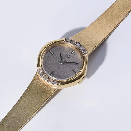 Gehäuse und Armband 585er Gelbgold, 10 kleine Diamanten. Zifferblatt und Werk signiert. Ankerwerk, Kaliber ETA 2512. Werk läuft, Handaufzug. Armband mit Faltschließe, Punzen: Feingehalt und HSP im Schild. L 16,5 cm, ø 22 mm. 34 g