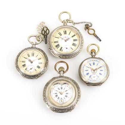 1x Halbmond/Krone/800 Silber gepunzt: Borel Fils & Cie., guillochiertes Galonné-Gehäuse mit leerer Wappenreserve, weißes Emailzifferblatt mit roten und schwarzen arabischen Zahlen, kleiner Sekunde und Spade-Zeigern, BFC gemarktes Werk mit Ankerhemmung, Werknummer 358300, läuft, Ø 5,1 cm, 87 g. 2x versilbert (geprüft): W & H, guillochiertes Gehäuse mit leerer Wappenreserve, weißes Emailzifferblatt mit römischen Zahlen, kleiner Sekunde und Louis Quinze-Zeigern, gemarktes Brückenwerk mit Zylinderhemmung und Schlüsselaufzug, mit Schlüssel, läuft kurz an, Ø 4,9 cm. Ungemarkt, floral reliefiertes Gehäuse, weißes Emailzifferblatt mit roten und schwarzen arabischen Zahlen, bezeichnet "Montre de Précision", kleiner Sekunde und floralen Zeigern, ungemarktes Werk mit Ankergang, läuft, Ø 4,8 cm