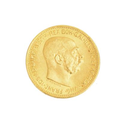 10 Korona Goldmünze, Ungarn Version 1909, krappengefasst in durchbrochenem Rahmen. Venezianerkette mit Ringfederschließe