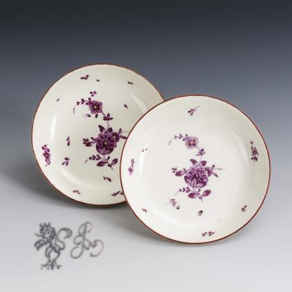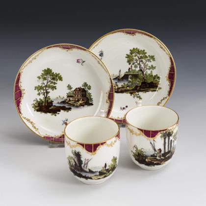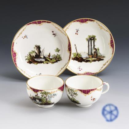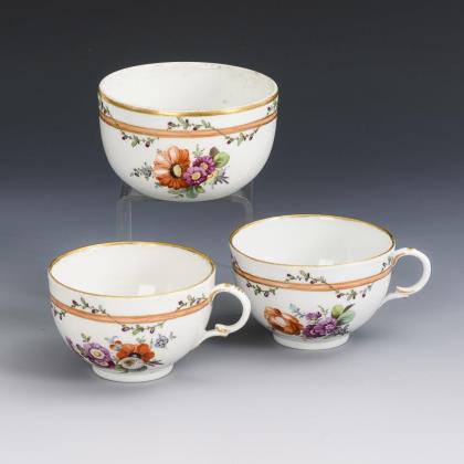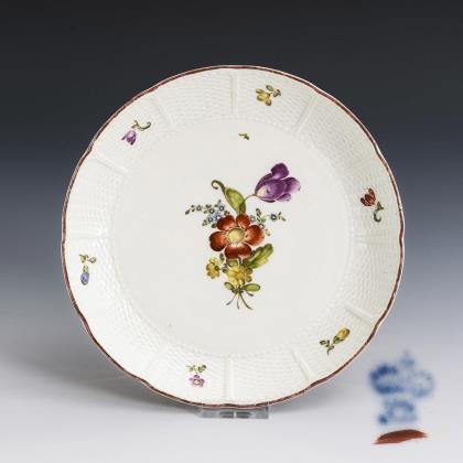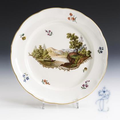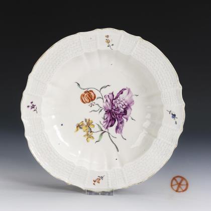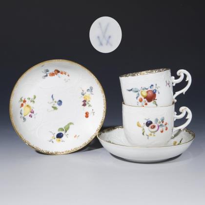 Aus einem Tafelservice für König Friedrich II. von Preußen. Reliefdekor "Alt-Dulong". Farbige Bemalung mit Früchten und Blüten. Goldspitzenbordüren, Goldstaffage. Schwertermarken