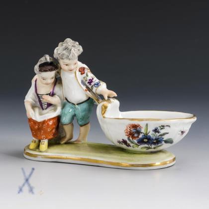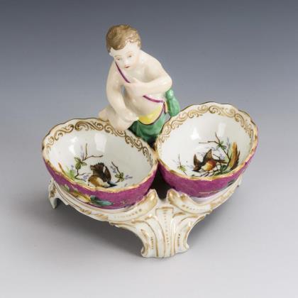 Zwischen zwei Salzschalen stehender, sich den Finger leckender Putto, auf Rocaillesockel