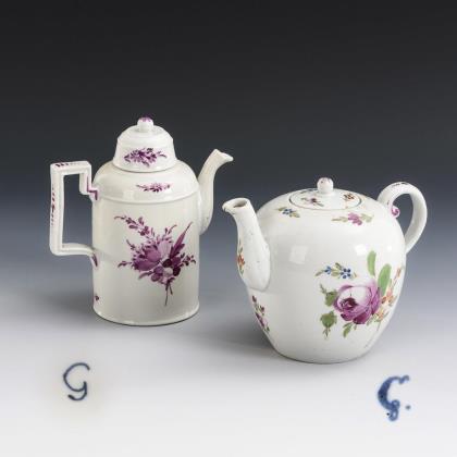 Zylinderkanne mit gewinkeltem Henkel und bauchige Teekanne mit Rocaillehenkel