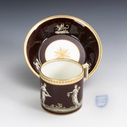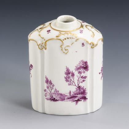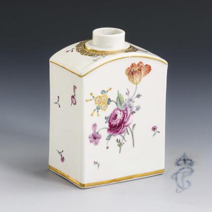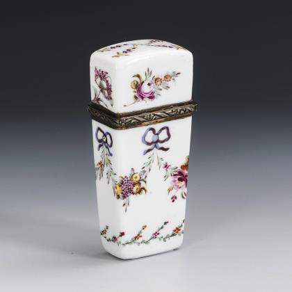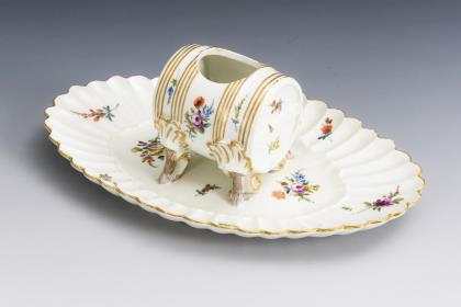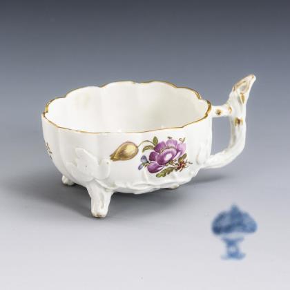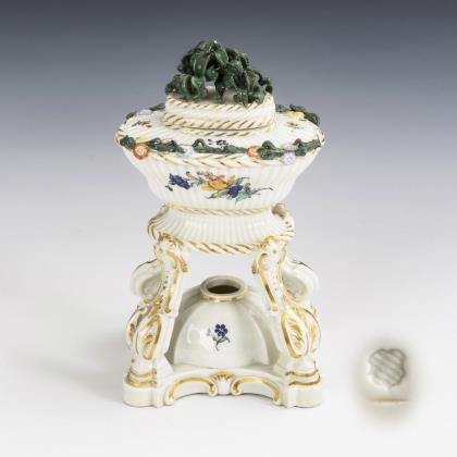 Umlaufend ornamental reliefiert, farbig und gold staffiert. Geschweifter quadratischer Korpus nach einem Meissen-Modell. Unglasierter Boden, LB-Marke