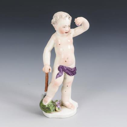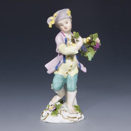 Knabe mit Trauben-Girlande. Farbig bemalt, gold staffiert. Unglasierter Boden, Schwertermarke am Sockel