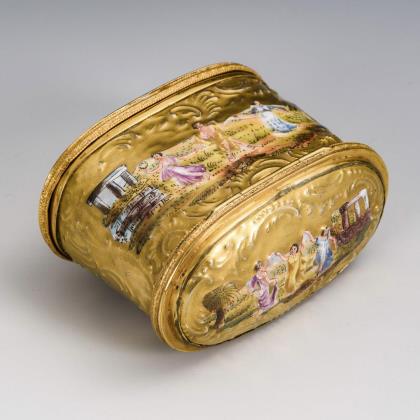 Ovale Dose mit zwei metallmontierten Scharnierdeckeln und allseitigem Rocaille- und Figurenrelief mit Tanz- und Badeszenen, innen jeweils Streublümchenmalerei
