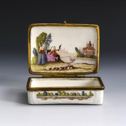 Rechteckige Dose mit Rocaille- und Blütenrelief sowie metallmontiertem Scharnierdeckel. Bemalt mit Flusslandschaften mit Architektur und galanten Figurengruppen