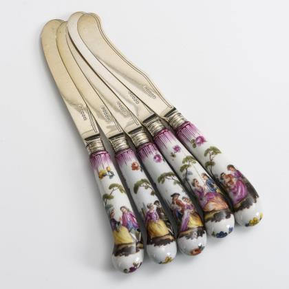 Messer mit Watteaumalerei auf den Porzellangriffen, versilberte Klingen