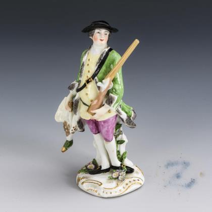 Auf einer Rocailleplinthe stehender Jäger mit Gewehr und erlegter Wildente