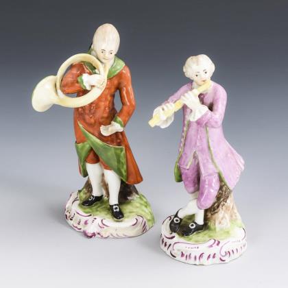 Hornspieler mit langem Mantel und Querflötenspieler mit gekreuzten Beinen