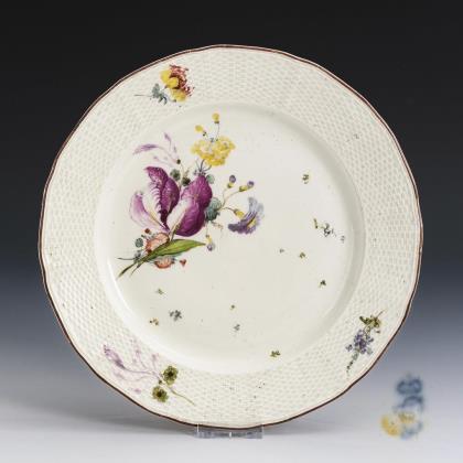 Teller mit durchbrochener Fahne. Im Spiegel die Darstellung eines galanten Paares in einer Parklandschaft