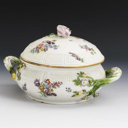 Reliefiert, gold staffiert. Allseits feine farbige Bemalung. Umlaufend in vier Kartuschen "Schlachtenszenen". Auf der Deckplatte Blumenbuketts und Einzelblüten. Ovaler passig geschweifter Korpus. Schwertermarke