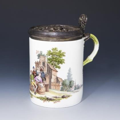 Umlaufend farbig bemalt. Frontal großflächige bäuerliche Genreszene, rückseitig gestreute Blüten. Walzenkrug mit reliefiertem, lindgrün staffiertem Asthenkel. Silber-Deckel mit Wirtshausszene im Hochrelief und Rocaillen-Drücker 19. Jahrhundert. Deckel ohne Marken. Humpen mit unglasiertem Boden, ohne Marke