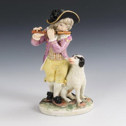 An einem Hund stehender, eine Querflöte spielender Knabe
