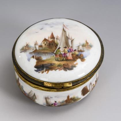 Runde, innen vergoldete Dose mit metallmontiertem Scharnierdeckel und Rocaillerelief. Allseitig die Darstellung von Küstenlandschaften mit reicher Figurenstaffage