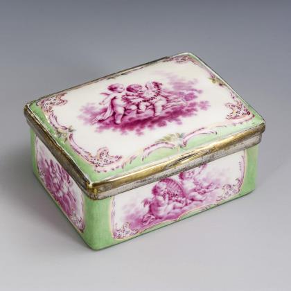 Rechteckige Dose mit metallmontiertem Scharnierdeckel. Grüner Fond mit rocaillereliefgerahmten Kartuschen, darin purpurfarben gemalte, auf Wolken schwebende Puttenpaare, im Deckel die Darstellung von drei Putten mit Muscheln zwischen Schilfgras