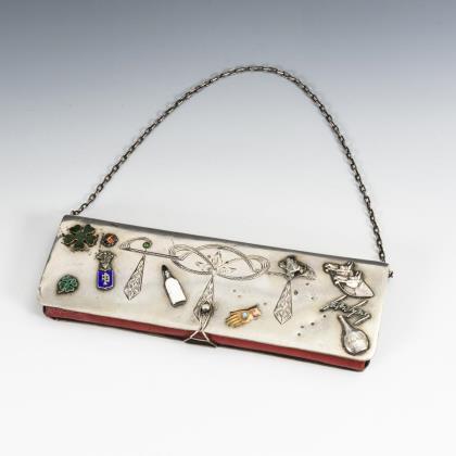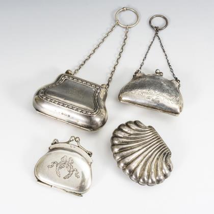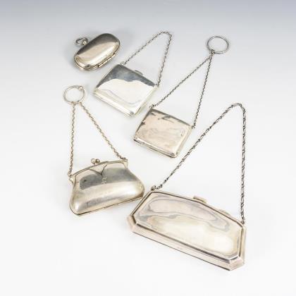 Verschiedene Täschchen und Geldbörsen, meist unverziert und an kurzer Kette, 1x jünger graviert "J. 14. 3. 1992"