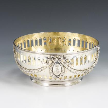 Runde Schale im klassizistischem Stil mit stabförmig durchbrochener Wandung und teilplastischen Festons. 1x bekrönte und ligierte Monogramm-Gravur "AB"