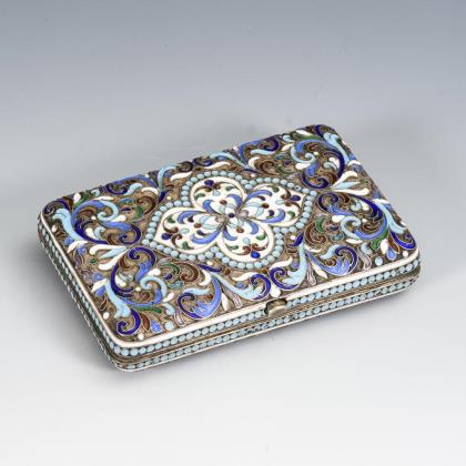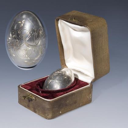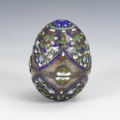 Zusammengesteckte, handgetriebene Eihälften mit vegetabilem Ornament aus farbigem Email in aufgesetzten Filigranstegen. Schachtel ergänzt