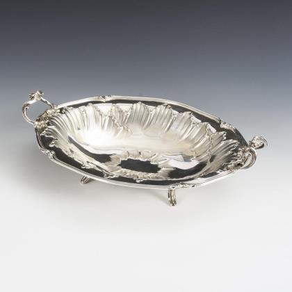 Geschweifte, ovale Schale mit kräftiger floraler Reliefierung und 2 rocaillierten Griffen, auf 4 Füßen