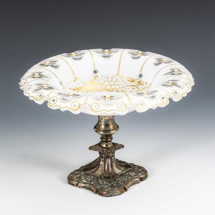 Weiße Schale mit Linsenschliff und Goldmalerei. Auf reliefiertem Fuß