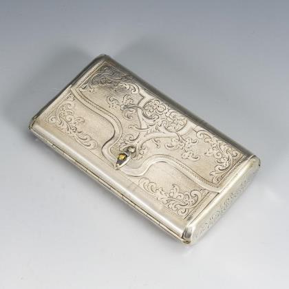 Kleines Etui mit Gravuren und aufgelegten Signaturen in lateinischer und kyrillischer Schrift. Innen 3 kleine Fächer