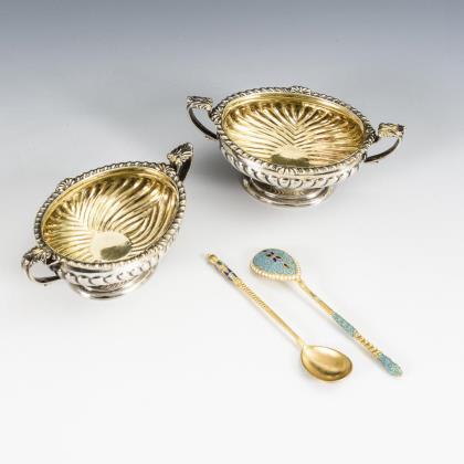 Ovale Fußschälchen mit geripptem Korpus und Kordelrand, innen vergoldet. / 2 fein verzierte Cloisonné-Löffel mit gedrehtem Stiel