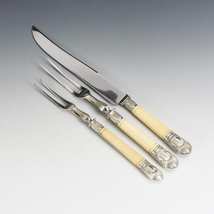 3-teiliges Tranchierbesteck (Messer und 2 Gabeln) mit gerippten Silbermontierungen an den Griffen