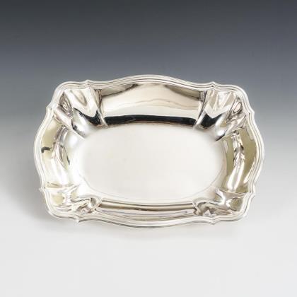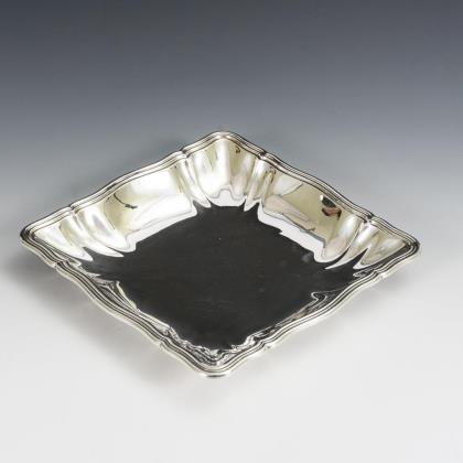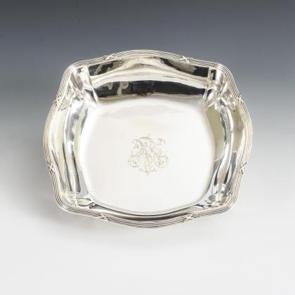 Geschweift gebuckelte Quadratschale mit Reliefrand mit Kreuzbandmotiv und verschlungener Monogramm-Gravur